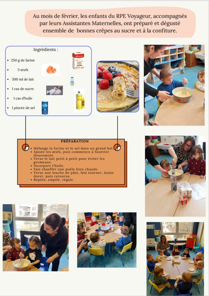 Au mois de février, les enfants du RPE Voyageur, accompagnés par leurs Assistantes Maternelles, ont participé à un atelier de préparation et de dégustation de crêpes. Petits et grands ont bien apprécié ce moment de partage.